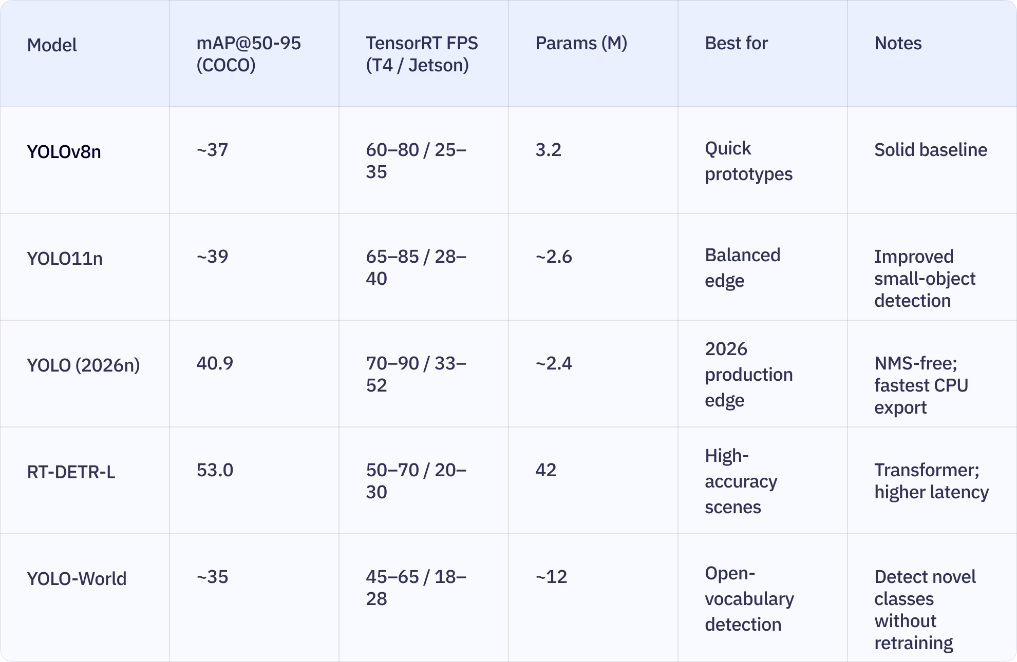 Choose the right detector based on your hardware constraints and scene demands. The table below compares the main options on COCO benchmark metrics and edge FPS estimates.