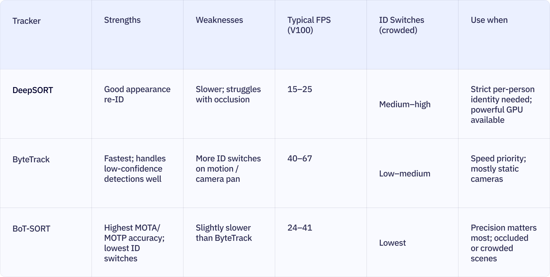 Pair detection with native trackers: BoT-SORT for accuracy in crowded or occluded scenes, ByteTrack for lower overhead and higher throughput. DeepSORT remains a valid option if your use case requires custom appearance-based re-identification features, though most teams now skip it in favour of the native options, which require far less tuning.