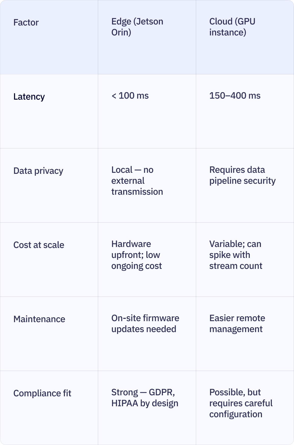 For most enterprise surveillance, edge is the right default. Latency stays under 100 ms, footage never leaves the premises, and ongoing costs are predictable. Cloud deployment makes sense for centralised analytics across dozens of distributed sites — stream metadata and alerts only, not raw video.