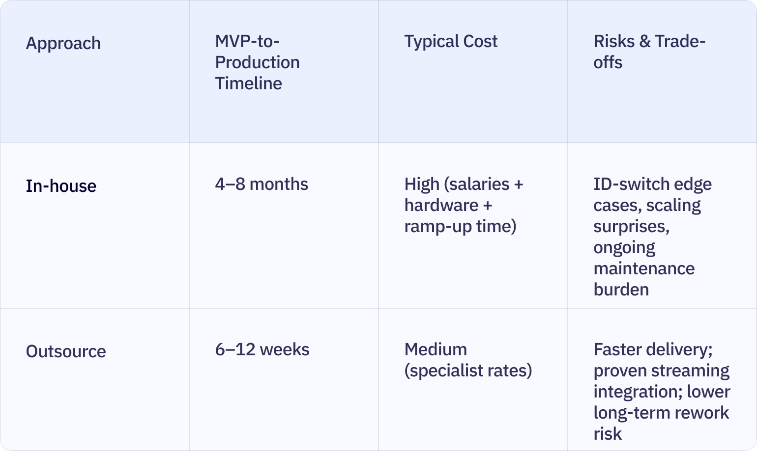 If your core business is not video AI, building the detection and streaming layer yourself carries real hidden costs: the learning curve on tracker tuning, RTSP quirks, WebRTC NAT traversal, and compliance documentation. Specialists who have already shipped multi-camera platforms know where the edge cases live.